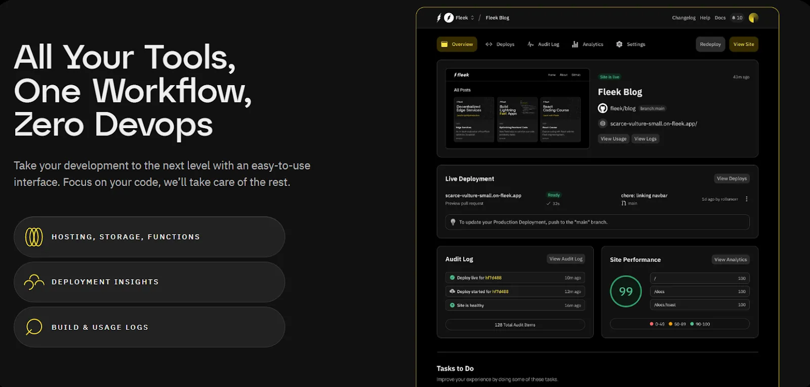 Fleek merges the worlds of open source, self-hosting and cloud, providing the freedom and benefits of open-source and self-hosting with cloud-like performance and automation. It allows developers to manage their web applications on decentralized and permissionless cloud infrastructure that is lightning fast, low cost, highly reliable, and auto-scalable, and without any of the corporate nonsense you typically experience with corporate cloud platforms like price gouging, data abuse, account suspensions, etc. .