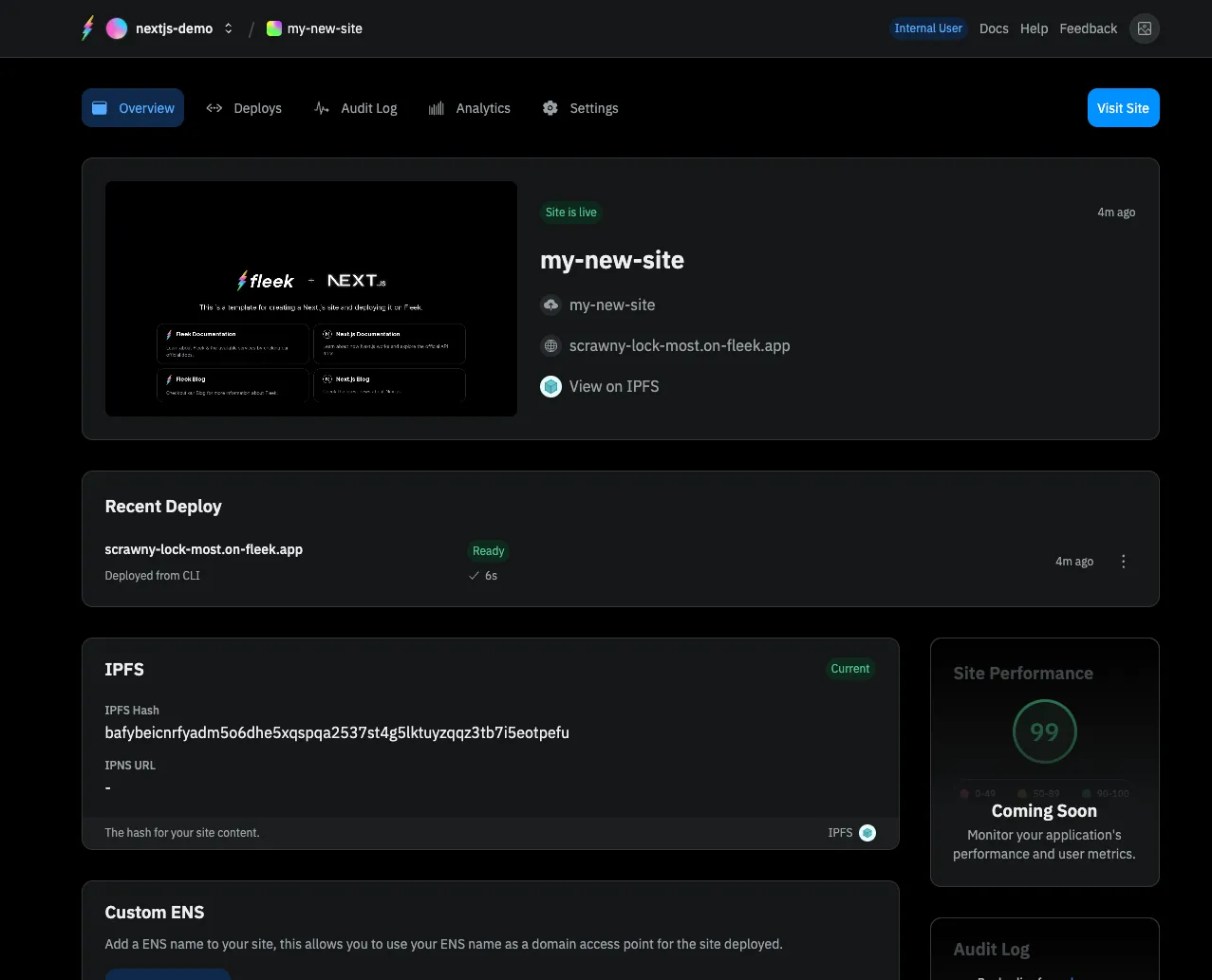 From the Fleek.xyz dashboard, you have the ability to manage a custom domain or ENS address for your site, as well as see deployment history and quickly manage site settings.