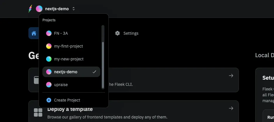 Now head over (authenticated) to the dashboard fleek.xyz/dashboard, and ensure you are on the right project (open the drop-down menu on the top left of the homepage and select the current project).