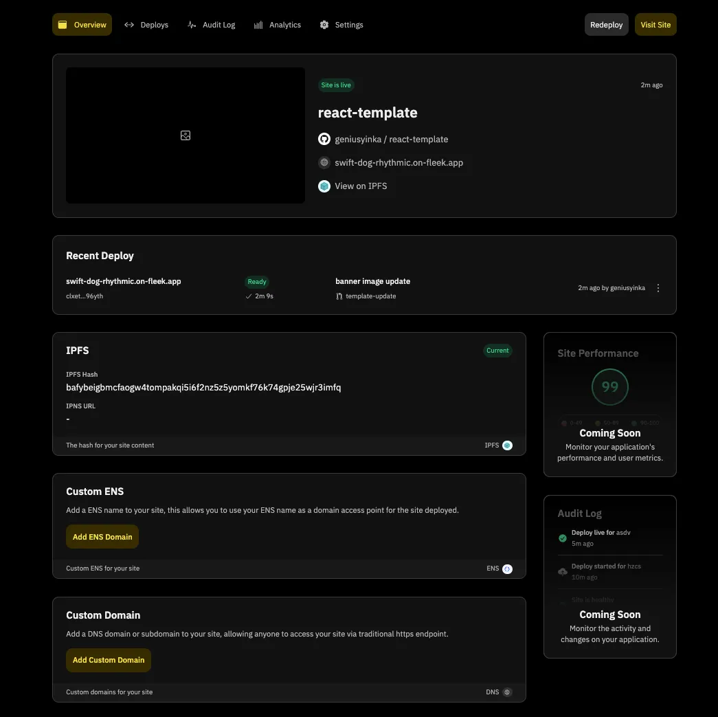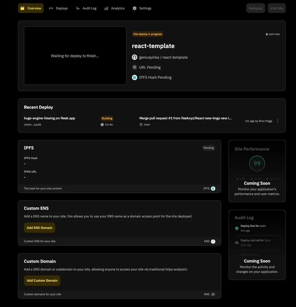 Once you are satisfied with the modifications you’ve made, simply click on the Deploy Site button to allow Fleek to begin the deployment process.