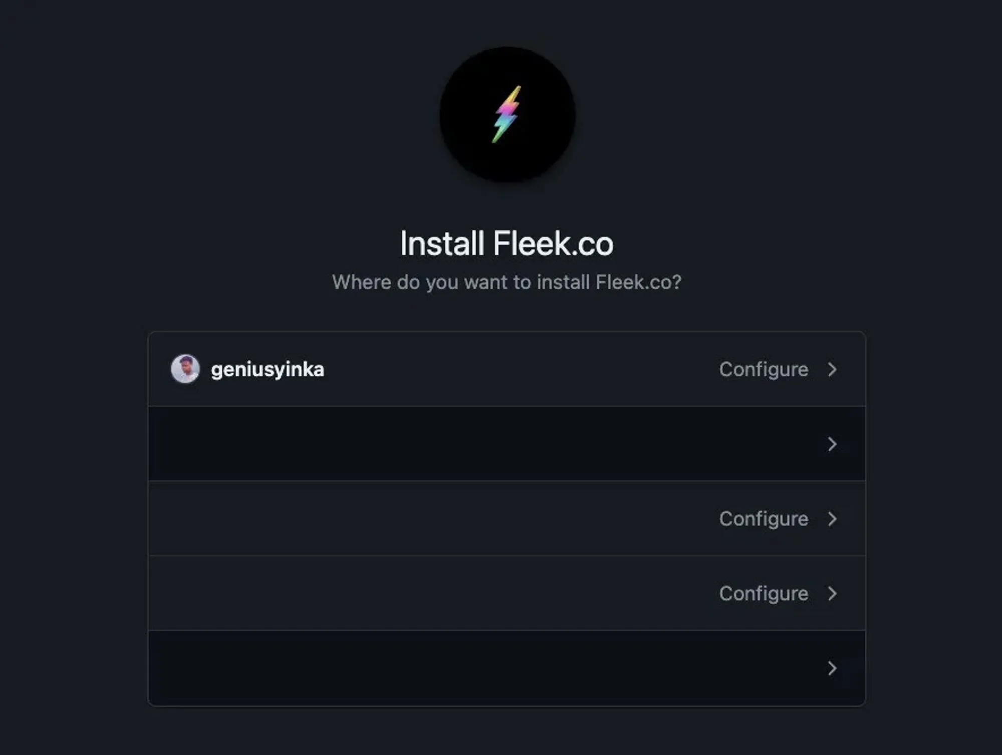 Once you’ve selected the repo(s) you would like to grant Fleek access to, click Save. You should see this— the image below shows a list of repos Fleek has access to.