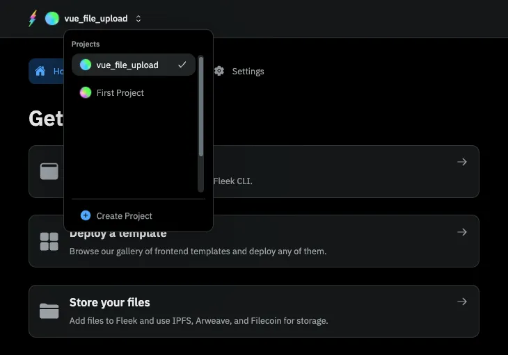 Now head over to the dashboard https://fleek.xyz/dashboard, and ensure you are on the right project (open the drop-down menu on the top left of the homepage and select the current project).