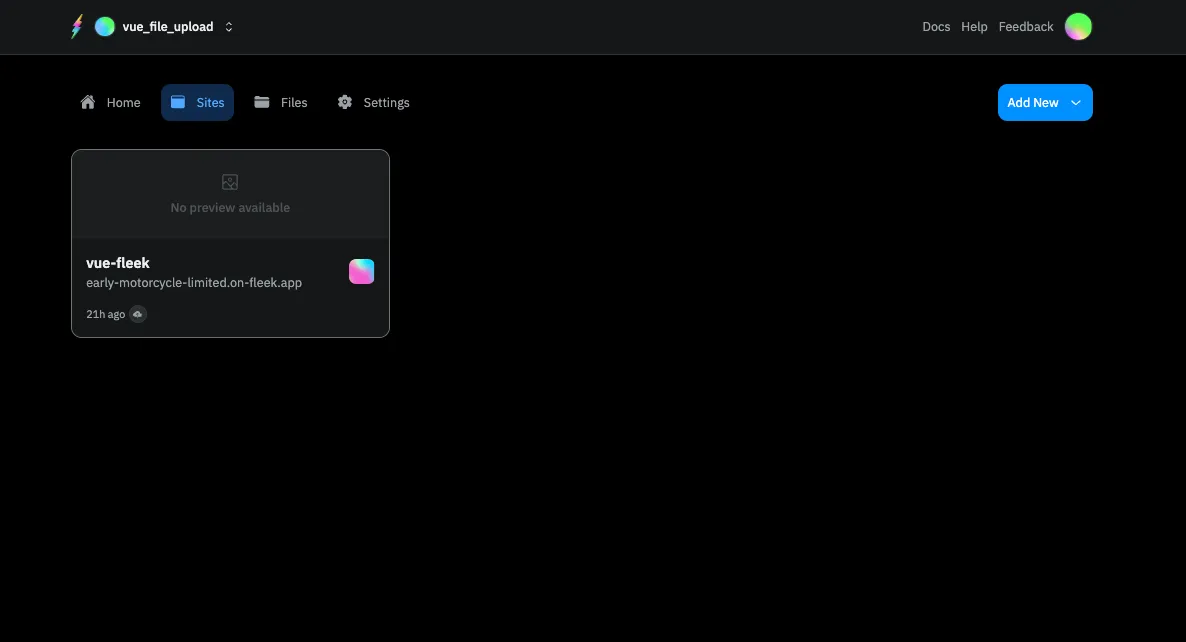 Now that we’ve created our Fleek account and installed the CLI, let’s proceed. If you want to follow along, the next step is to clone this GitHub repo. It’s a Vue.js template that we’ll use as the base for our file upload app: repo