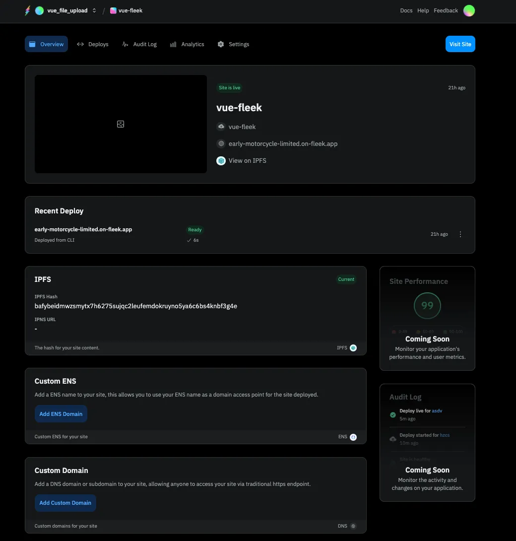 From the Fleek.xyz dashboard, you have the ability to manage a custom domain or ENS address for your site, as well as see deployment history and quickly manage site settings.