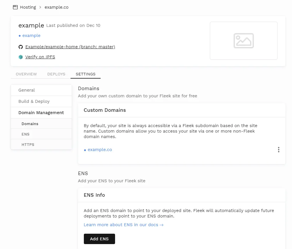 Once your deployment is successfully finished, you will see your website’s detail and configuration page. Navigate to the Settings → Domain Management tab, where you will find the ENS setup flow waiting for you.