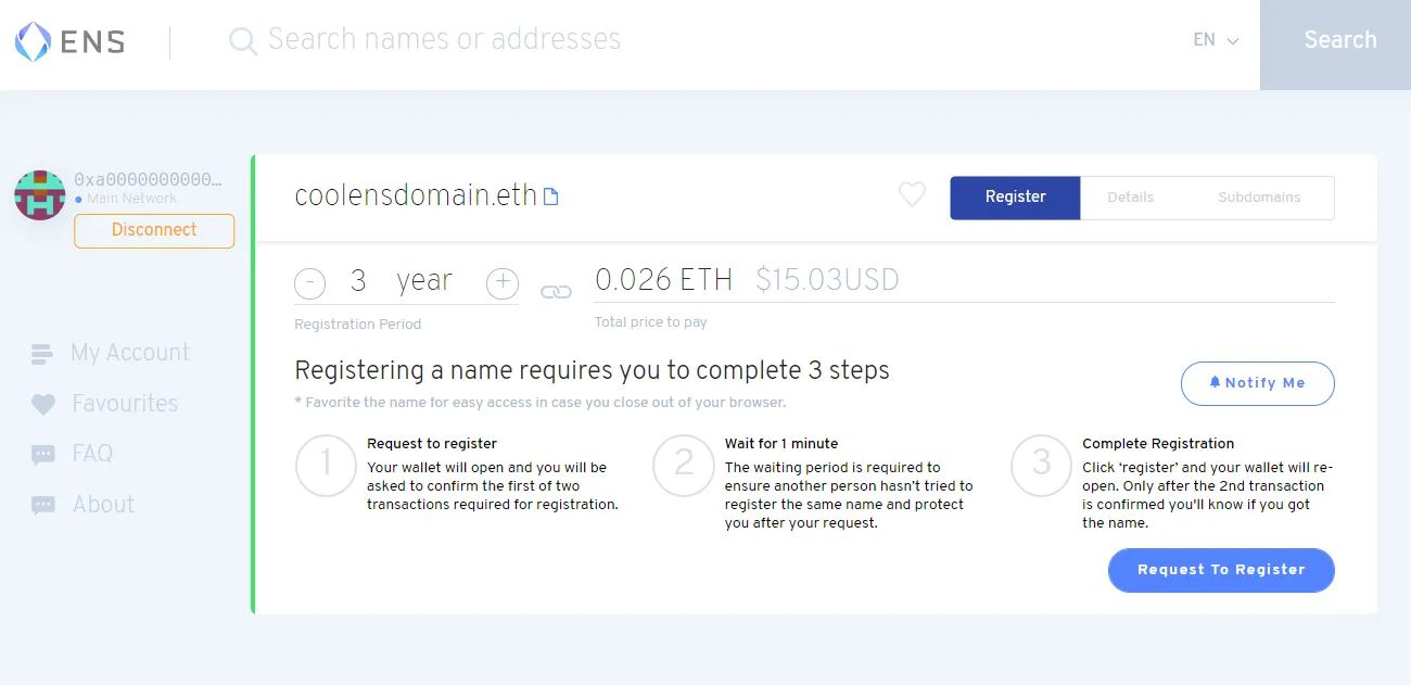 Choose for how long you will want to rent that domain, and verify the final ETH fee to pay. Once you’re good to go, hit “Request to Register” and a transaction will begin. It takes about one minute to verify because during that period the platform is verifying no one else already tried or is trying to acquire the same domain.