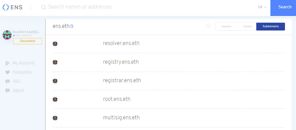 At its core, ENS is composed of two main pieces. Firstly, the ENS registry, which lives in a smart contract running on the Ethereum blockchain and has a record of all domains and subdomains, detailing the owner, resolver, and caching TTL (time-to-live) for all records under that domain.