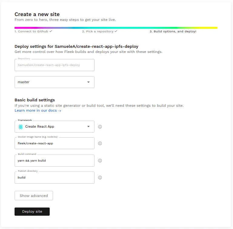 With the Github repository ready, deploying and hosting your site on IPFS takes just three steps: connect your repository, add your build settings, and deploy.